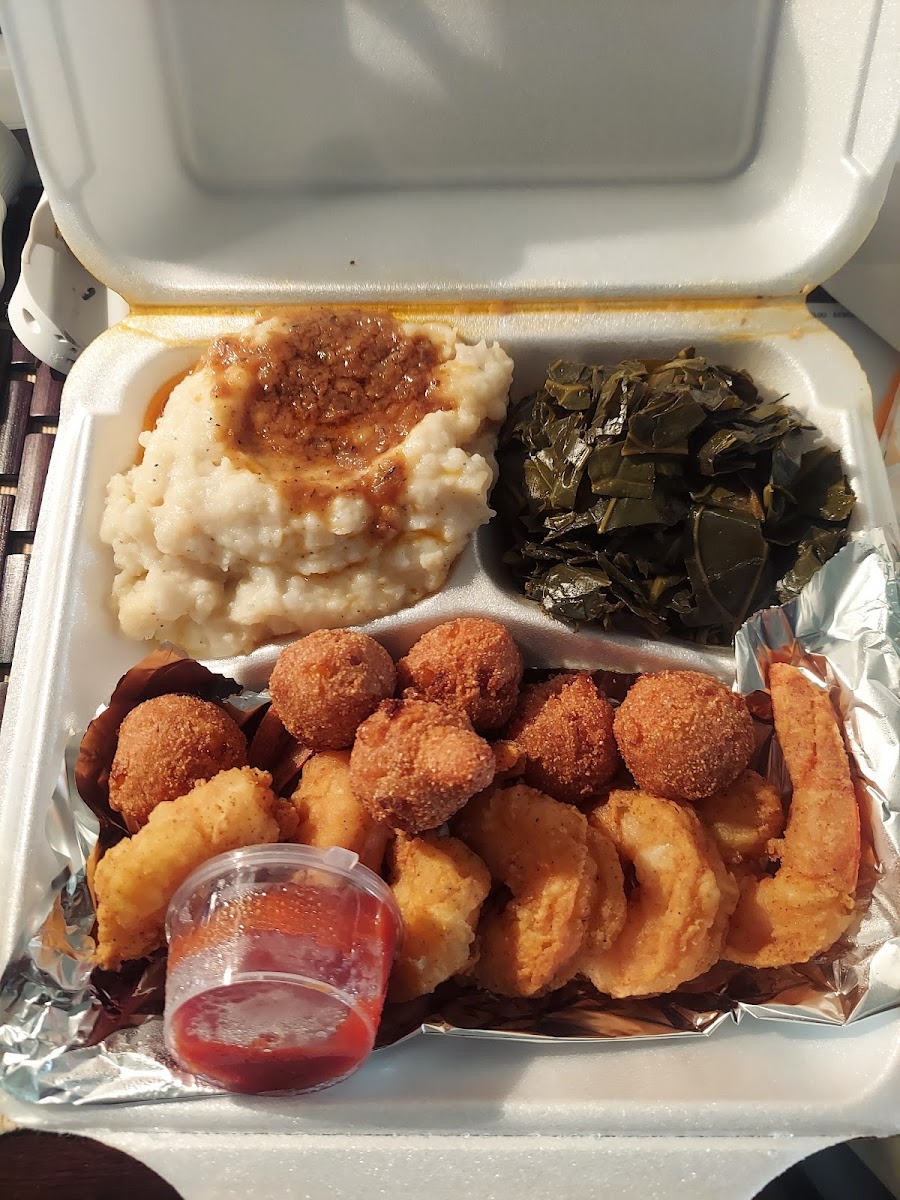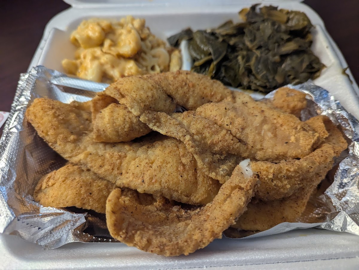 Whiting Collard Greens and Mac and Cheese: A Southern classic done right. The crispy, perfectly seasoned whiting pairs beautifully with the savory collard greens and creamy mac and cheese.