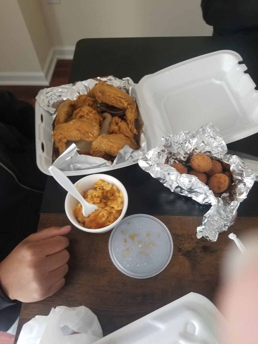 Chicken Wings with Mac and Cheese: Whether you’re here for lunch or a late-night snack, these chicken wings are seasoned to perfection, with a side of smooth and cheesy mac and cheese that complements every bite.