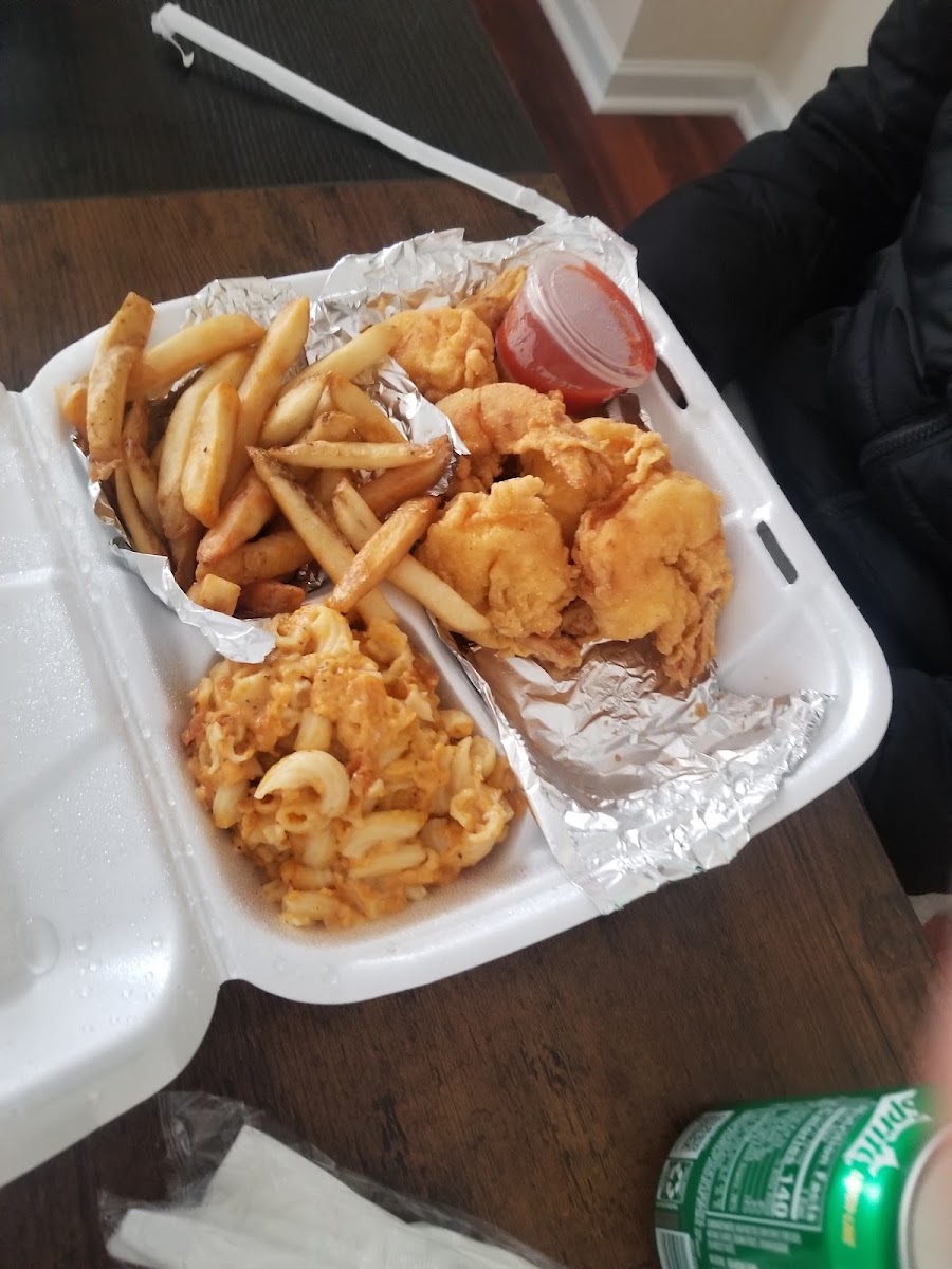 Shrimp with Mac and Cheese and Fries: This dish features juicy shrimp served alongside a generous helping of golden fries and creamy mac and cheese, creating the perfect combination of flavors.