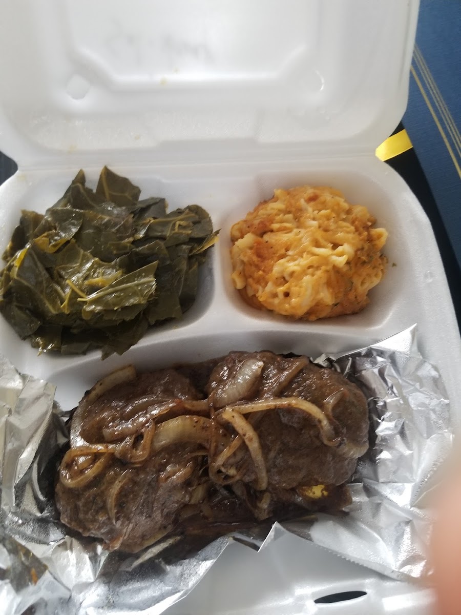 Salisbury Steak with Greens and Mac and Cheese: A hearty option, the Salisbury steak is tender and flavorful, paired with collard greens and mac and cheese for a truly filling meal.